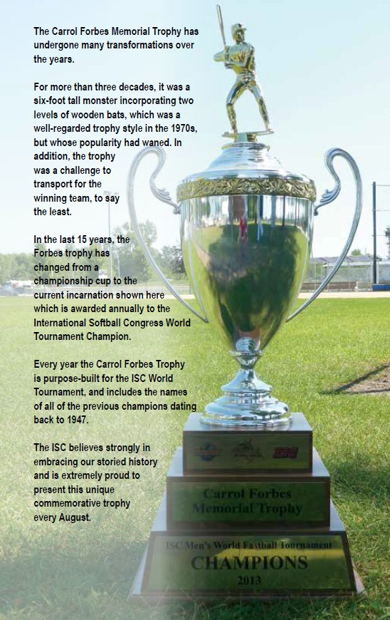The ISC, as we know it today, began as the National Softball Congress in 1947. The NSC was founded by LARRY WALKER of Phoenix, Arizona. Walker and others, including CARROL FORBES of Greeley, Colorado, were dissatisfied with some of the policies of the national governing body for softball at the time. The NSC held championships for men and women and operated from 1947 through 1957. In December 1950, Forbes, a former president of the NSC, split with Walker and formed a new male-only organization, the International Softball League. From 1951 thru 1957 both the NSC and ISL held championship tournaments. The NSC ceased operations in 1957 and Forbes brought some of the NSC’s administrators into his group and renamed it the INTERNATIONAL SOFTBALL CONGRESS.